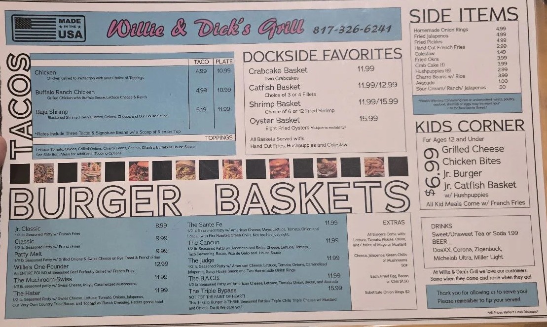 Welcome to Willie & Dick's Grill, a delightful hidden gem located at 424 Fall Creek Hwy, Granbury, TX. This casual and quirky eatery offers a vibrant dining experience, perfect for families and friends alike. The charm lies not only in its appealing decor but also in the fantastic menu that caters to all palates.